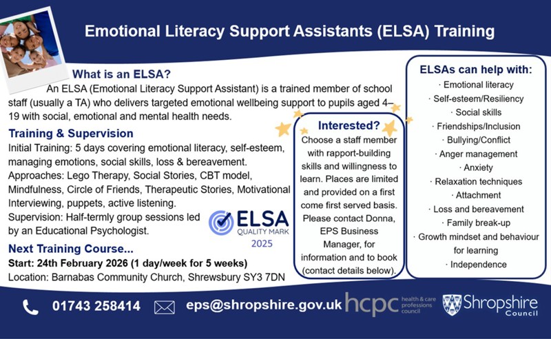 Please contact us for information about future ELSA training courses. For trained ELSAs, please contact us if you require any information, support or details regarding supervision sessions. Information can also be found on the ELSA Network website ELSA Network – Emotional Literacy Support Assistants
